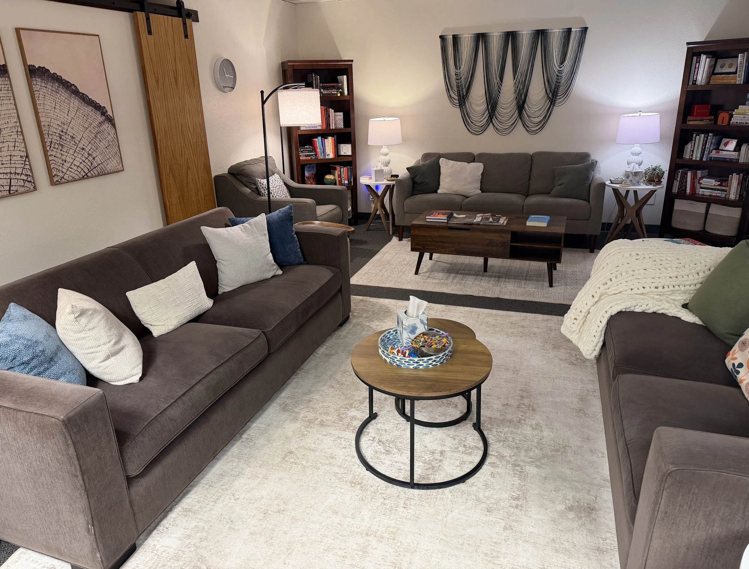 Settle into a calm, inviting waiting room shared with a community of therapists. Please help yourself to water, coffee, or tea while you wait.